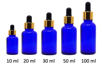 10 – 20 – 30 – 50 – 100 ml Cam Şişe Damlalık, Mavi cam damlalıklı şişe, Damlalıklı mavi Renk Cam Şişe Gold Başlıklı
