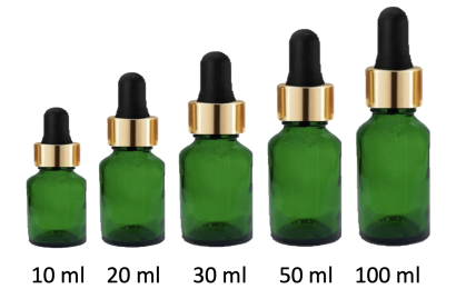 10 – 20 – 30 – 50 – 100 ml Cam Şişe Damlalık, Yeşil cam damlalıklı şişe, Damlalıklı Yeşil Renk Cam Şişe Gold Başlıklı