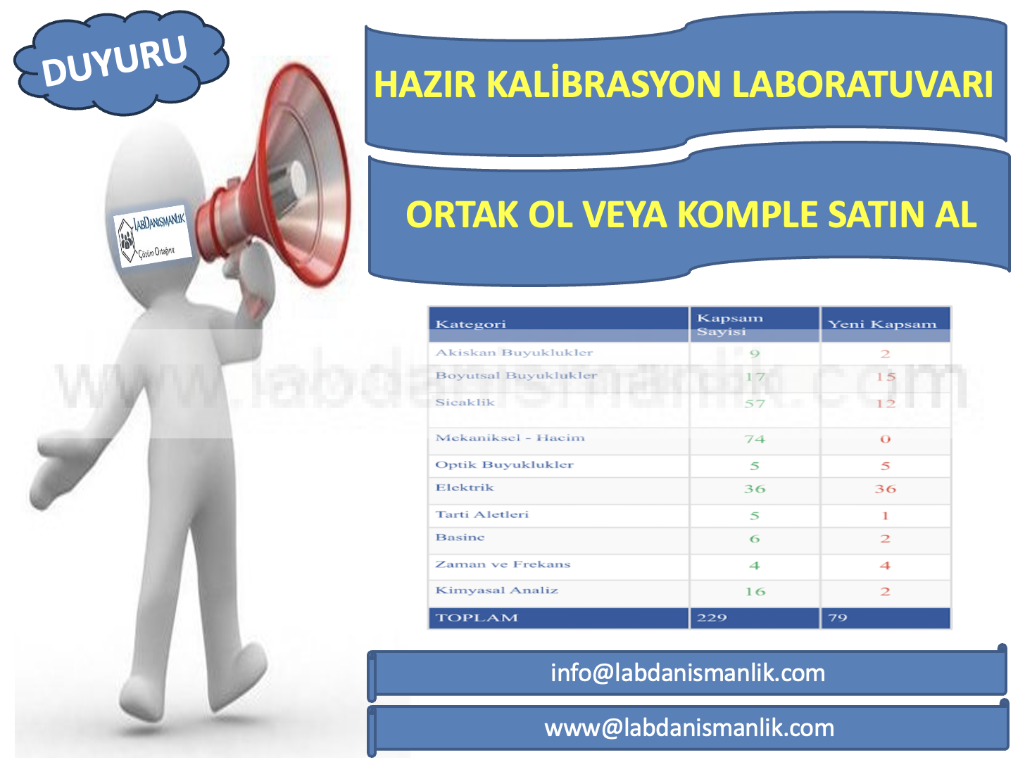 Devren Satılık Kalibrasyon Laboratuvarı veya Ortaklık İmkanı RUHSATLI SATILIK KALİBRASYON LABORATUVARI İSTER DEVREN SATIN AL, İSTERSEN ORTAK OL Kapsam listesi mevcuttur. Lokasyon: TÜRKİYE Detaylı bilgi için mail adresimizden ulaşabilirsiniz. info@labdanismanlik.com Açıklama