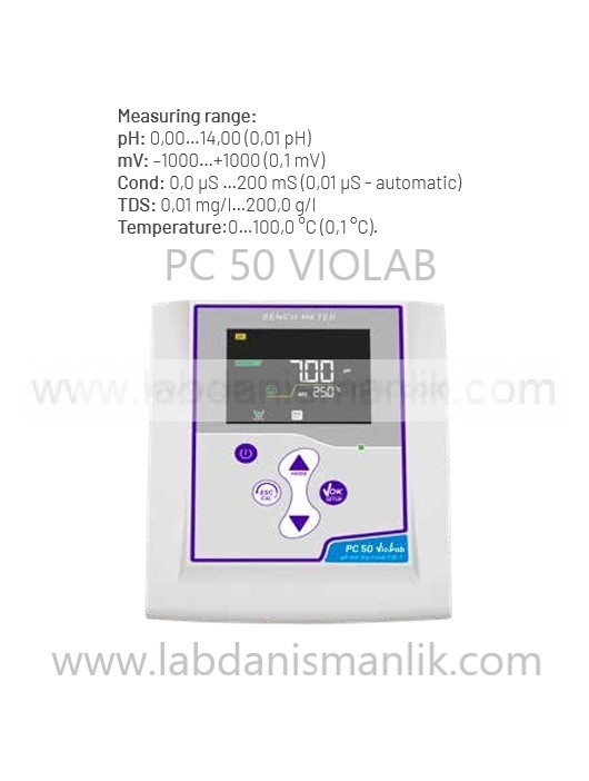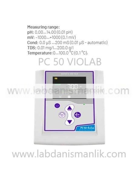 | PC 50 VIOLAB – WITHOUT ELECTRODE | With conductivity cell 2301T (C=1) , accessories, cable S7-BNC and temperature sensor NT 55 Without pH electrode | LD50103902 | pH + mV + COND + TDS + TEMP | pH: 0,00…14,00 (0,01 pH) mV: –1000…+1000 (0,1 mV) Cond: 0,0 µS …200 mS (0,01 µS – automatic) TDS: 0,01 mg/l…200,0 g/l Temperature:0…100,0 °C (0,1 °C). |